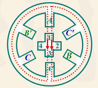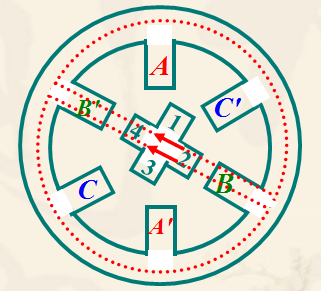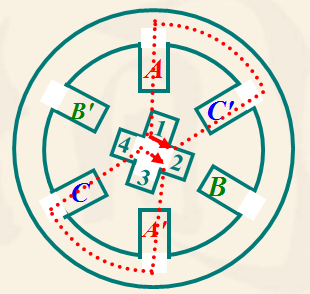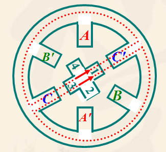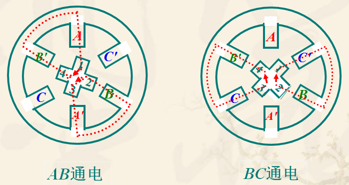 ![]() A 相通電使轉(zhuǎn)子1、3齒和 AA' 對齊。