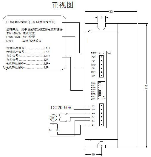 注:可根據客戶要求定制細分數! !注意 1、輸入電壓不能超過DC50V; 2、輸入控制信號電平為+5V-+28V范圍,高于+5V時無需外接限流電阻; 3、輸入脈沖信號下降沿有效; 4、驅動器溫度超過80度時驅動器停止工作,故障指示燈ALM亮,直到驅動器溫度降到50度時,驅動器需要重新上電才能恢復工作。出現過熱保護請加裝散熱器; 5、過流(負載短路)故障指示燈ALM亮,請檢查電機接線及其他短路故障,排除后需要重新上電恢復; 6、無電機故障指示燈ALM亮,請檢查電機接線,排除后需要重新上電恢復。 驅動器接線、尺寸示意圖