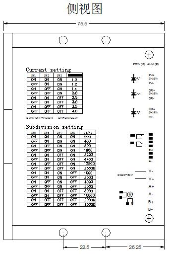 其中SW4為單、雙脈沖模式設定開關:OFF為單脈沖(PU+DR) ON為雙脈沖(CW/CCW) 細分設定 驅動器細分由SW5-SW8端子設定,共16檔。附表如:細分數(脈沖/轉)