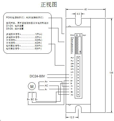 注:可根據(jù)客戶要求定制細(xì)分?jǐn)?shù)! !注意 1、輸入電壓不能超過DC80V; 2、輸入控制信號電平為5V,當(dāng)高于5V時(shí)需要接限流電阻; 3、輸入脈沖信號下降沿有效; 4、驅(qū)動器溫度超過80度時(shí)驅(qū)動器停止工作,故障指示燈ALM亮,直到驅(qū)動器溫度降到50度時(shí),驅(qū)動器需要重新上電才能恢復(fù)工作。出現(xiàn)過熱保護(hù)請加裝散熱器; 5、過流(負(fù)載短路)故障指示燈ALM亮,請檢查電機(jī)接線及其他短路故障,排除后需要重新上電恢復(fù); 6、無電機(jī)故障指示燈ALM亮,請檢查電機(jī)接線,排除后需要重新上電恢復(fù)。 驅(qū)動器接線、尺寸示意圖