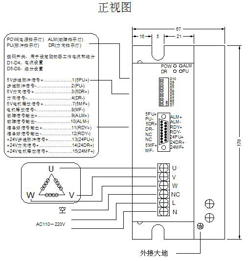 | 13 | 24PU+ | 輸入信號光電隔離正端 | +24V可驅動 | 14 | 24DR+ | 輸入信號光電隔離正端 | +24V可驅動 | 15 | 24MF+ | 輸入信號光電隔離正端 | +24V可驅動 | 電機、電源端 | 1、2 | L、N | 電源 | 電源:AC110-220V | 3 | PE | 地線 | 大地(內接驅動器外殼) | 4 | U | 電機接線 |